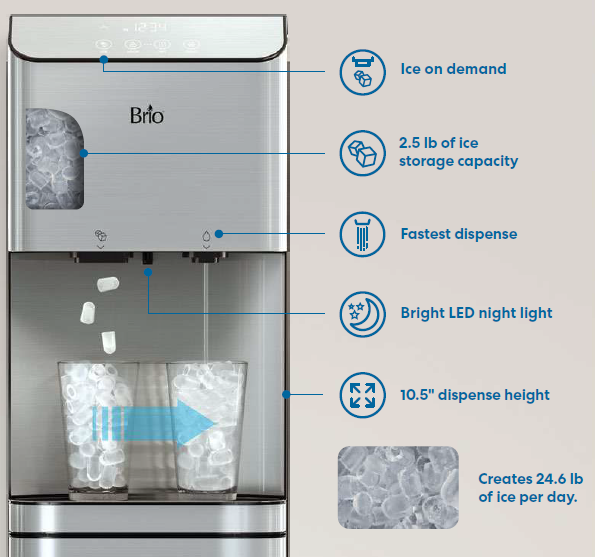 The best of both worlds—the Brio Moderna Ice Dispenser & Water Cooler dispenses ice and water. Effortlessly enjoy up to 24.6 lb. of ice per day, piping hot water, and refreshing cold water—all at the press of a button. Plus, with a 10.5″ dispense height and larger solenoid valve, tall glasses and pitchers fit easily and fill quicker than ever before.